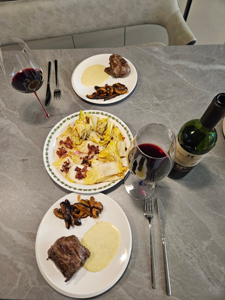 타임으로 마리네이드한 양목심 스테이크와 와사비마요소스 / 화이트 와인과 발사믹에 졸인 버섯 / 크리스피 베이컨을 올린 알배추 구이와 페어링했는데 아주 좋았다.